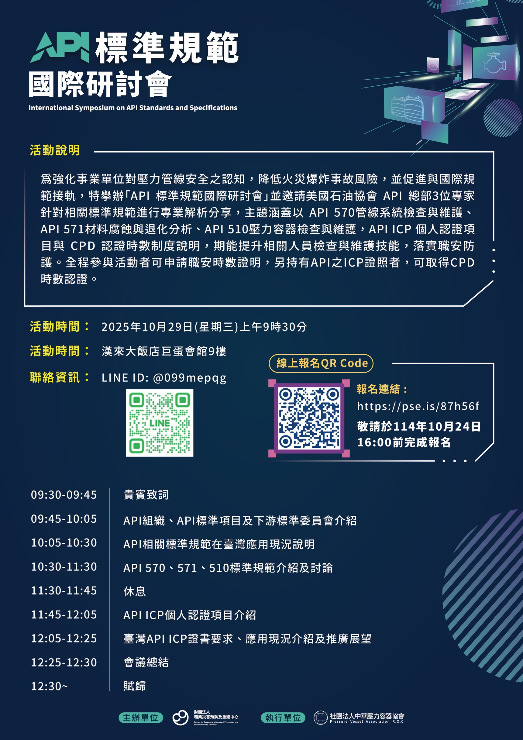 2025/10/29 API 標準規範國際研討會,全程參與可申請職安訓練時數,另持有API之ICP證照者可申請CPD時數認證----1141015